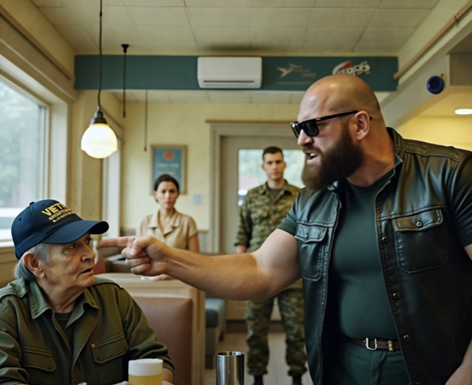 Ветеран не ответил. Он наклонился, поднял свою кепку, вытер рукав и шепотом сказал официантке: «Можете ли вы дать мне телефон-автомат? Мне нужно связаться с сыном.» Он набрал номер, его голос был спокойным и уравновешенным. Затем он ждал, взгляд был устремлен в окно.